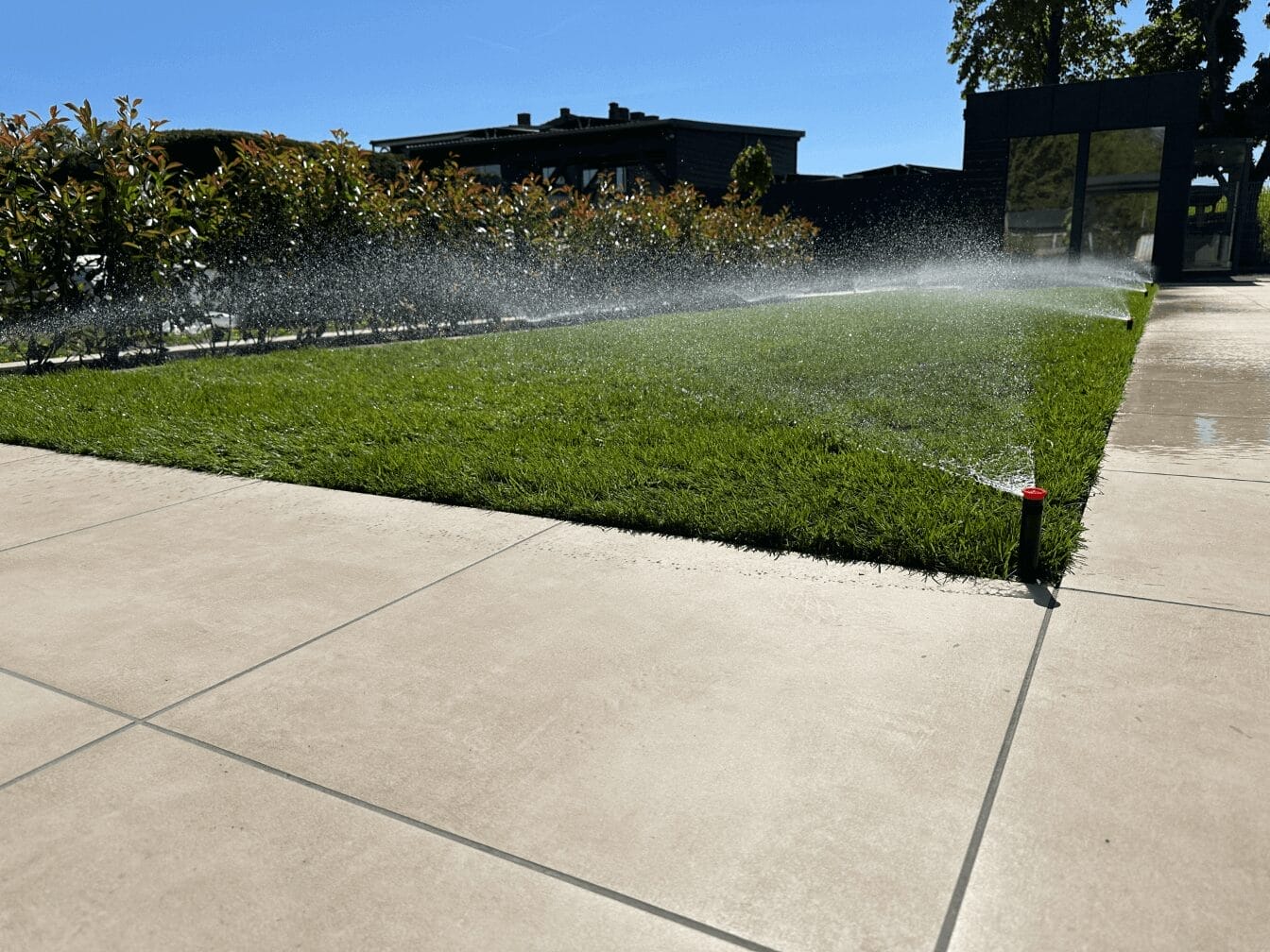 Doch ein schöner Rasen allein reicht nicht. Damit er langfristig gesund bleibt, braucht er eine gleichmäßige und bedarfsgerechte Wasserversorgung. Hier kommt unsere Stärke ins Spiel: die automatische Gartenbewässerung nach Maß. In diesem Projekt haben wir auf die bewährte Qualität von Hunter-Düsen gesetzt. Diese ermöglichen nicht nur eine gleichmäßige Verteilung des Wassers, sondern sind auch besonders effizient im Verbrauch – ein Plus für Umwelt und Geldbeutel.
